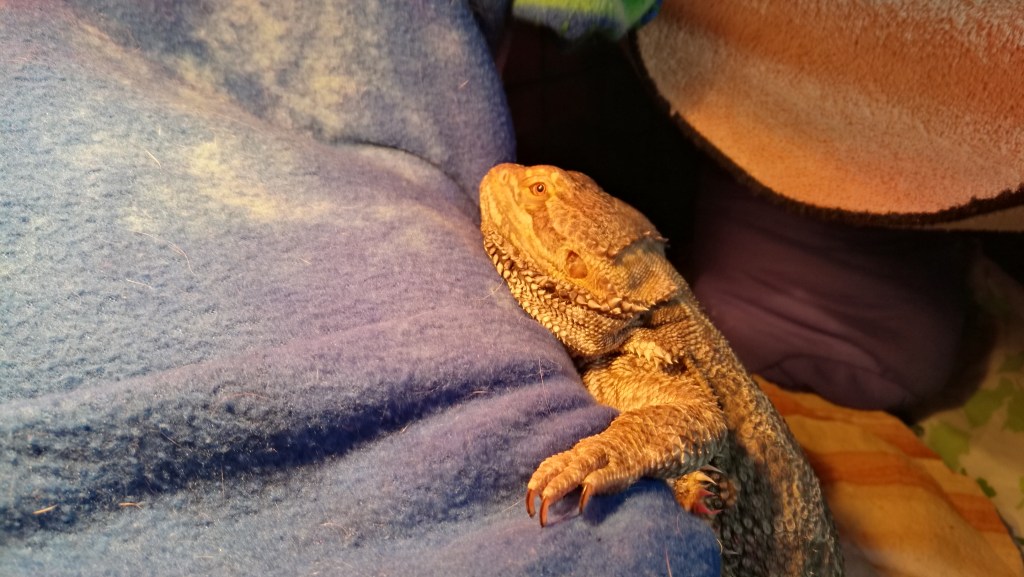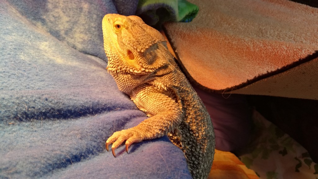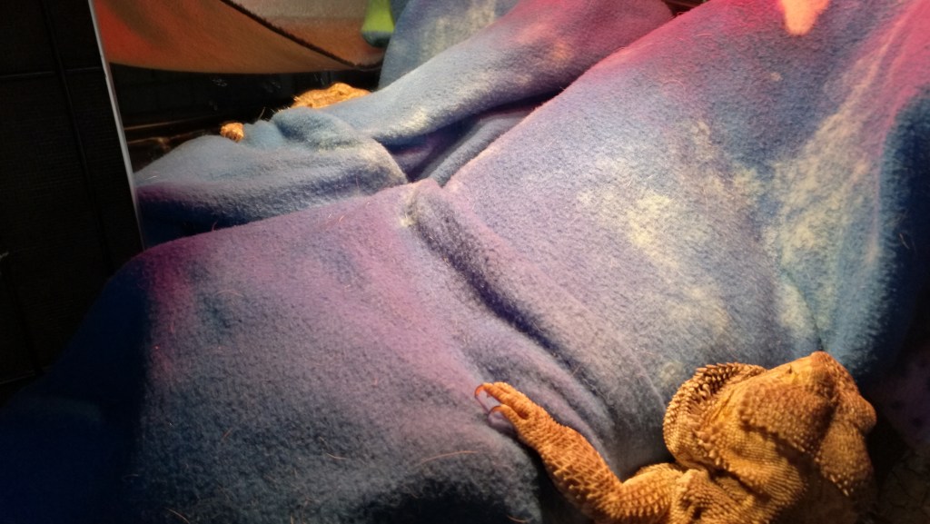 Well, I’m not sure, but I think I captured every mood and expression while he was in possession of the blanket. I really need to clean out my phone! Zoom in, click or tap on the photos to get a good look at that happy face!! Lizards do have expressions!