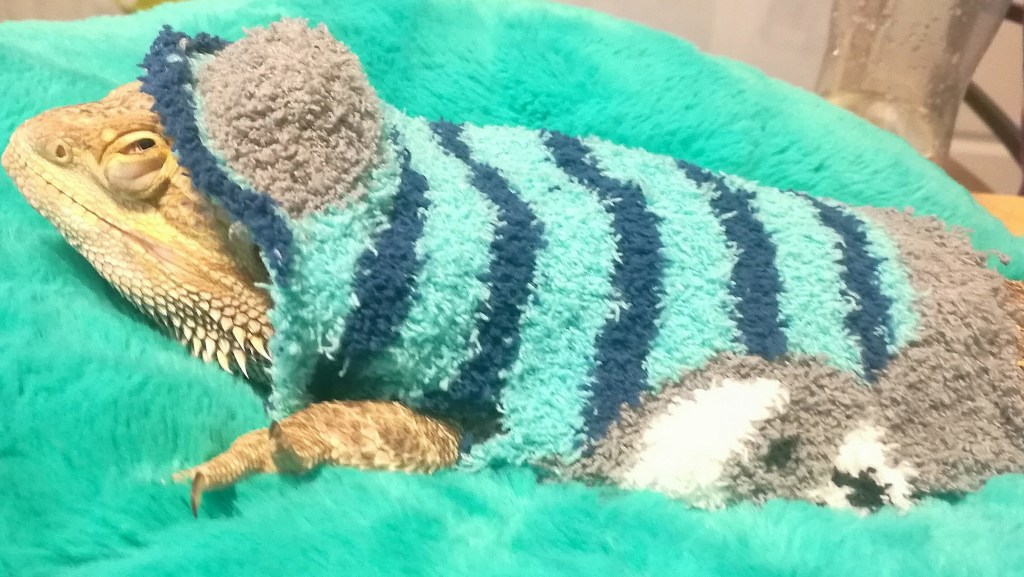 Well, I removed the hoodie and placed him onto his Princely bed which contained the matching pillow… the verdict is still out on his acceptance level of said hoodie.