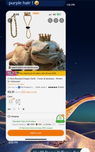 Someone texted me a screenshot of a Temu ad. Knowing my love for lizards and having been a caretaker of Murph while I’m away from home, she thought I’d just adore this: