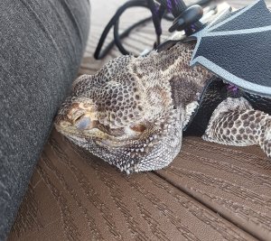 •HARNESS WITH A LEASH– A harness with the attached leash is helpful in some situations, especially if your animal walks more than a few steps at a time (compare a larger green iguana to the docility of a Beardie). You can temporarily secure the leash around a heavy or immovable object if you need both hands for a minute. I think these are good, but as stated, only in some situations. And certainly, don’t attach them to something when you are so busy you cannot keep watch. Your friend may get stepped on by you or someone else, or ingest insects they shouldn’t, especially if those insects have gotten into chemicals somewhere.