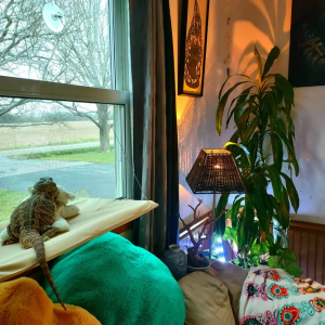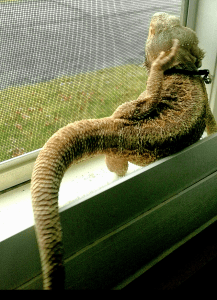 •GIVE A WINDOW VIEW – Place your little one, assuming it’s not too active, at the window while you toil in the kitchen. Just don’t leave the room while they are there. You can place something soft onto the sill or near it for comfort. Just a suggestion: Place a sturdy prop under that window if it is a vertically opening design. Every window that doesn’t work had a day when it failed. We have a window, the kitchen one, unfortunately, that we prop open with a thick, wooden plank because an interior mechanism failed before we moved here. Believe me, even small windows are way heavier than presumed (I am not sure why all windows don’t open horizontally anyway). This sort of weight falling onto our tiny animals will do irreparable harm & they will suffer until they die. It is better to be safe than sorry here. Don’t use anything plastic for a fail-safe. Whatever you use needs to be durable. You can do this in any room. My bed is currently under a window, so I rest Murph on a bunch of pillows until he is high enough for the sun in the west to shine upon him when I’m in there cleaning. If I weren’t so used to his being by me, I could easily be so focused on the task at hand as to forget his quiet self is over there.