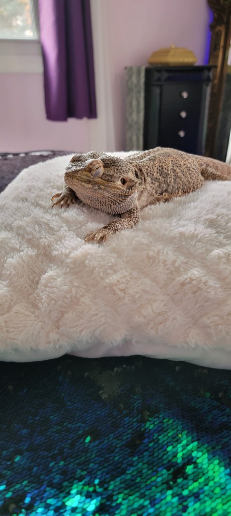 There is masculine charm. I guess there’s feminine charm, and apparently, there is lizard charm. If you care as you get to know one (especially Murph) and hold one (especially Murph), you’ll “speak” lizard soon.😁 You will begin to see they express themselves with body language and in their eyes, on their otherwise expressionless faces. Can you see how much he loves love? Lizards love their humans who show them love, and they’ll prove it to you in their unique, individual ways.