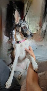 But, it’s okay. Jazzy (named either by her human mother who abandoned her at the local shelter or by the shelter staff) is awesome! She is so well-behaved nearly all of the time. She has cute quirks of personality and is comical to watch. She does this adorable thing of sitting upright and crossing her wrists around forearms as someone pets her chest. I’ve not been able to capture a photo of this as she looks up with puppy-dog eyes, but I have this one, after she moved, of course: