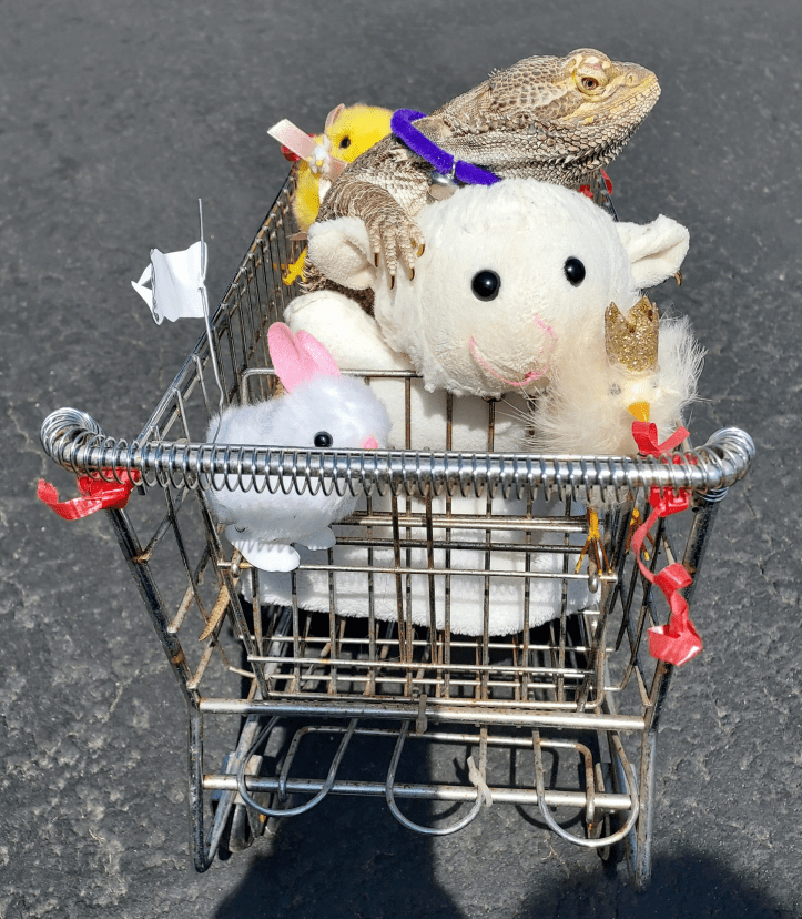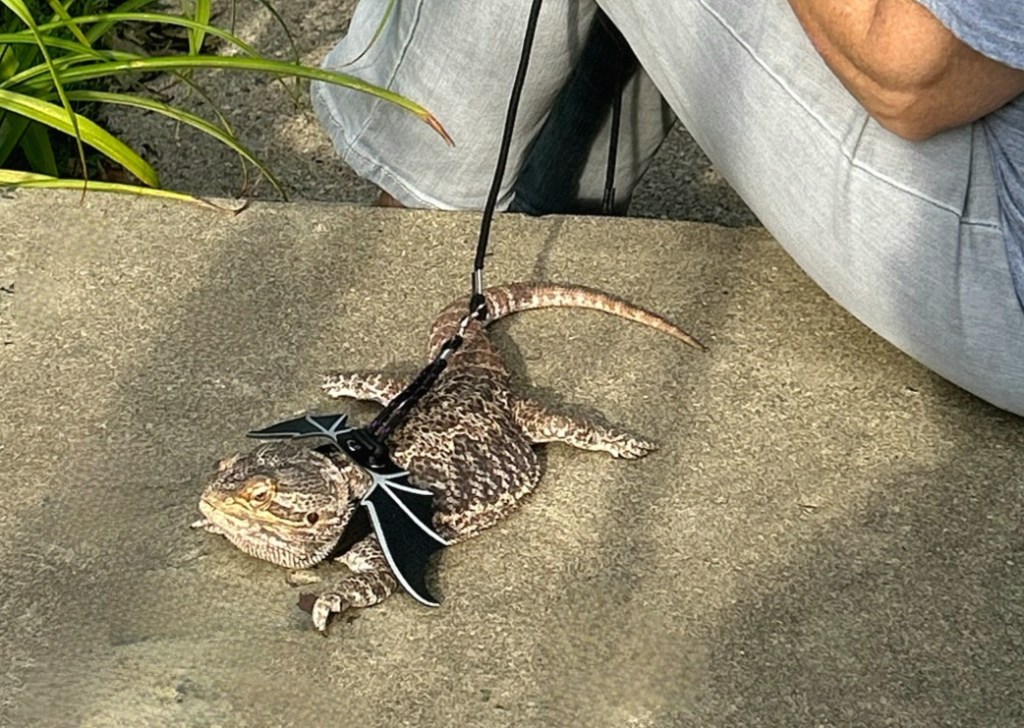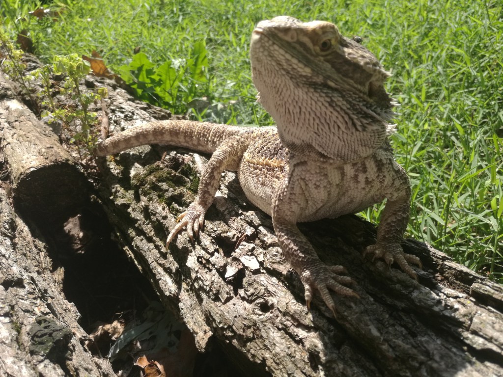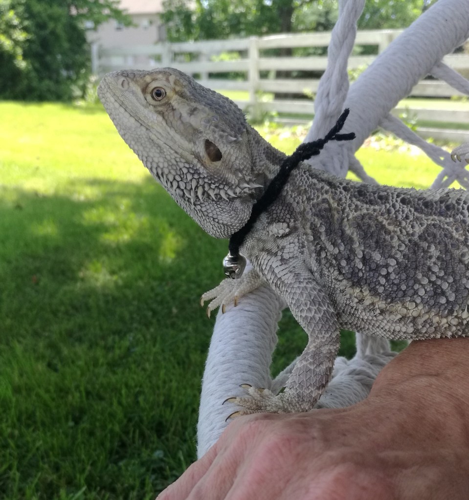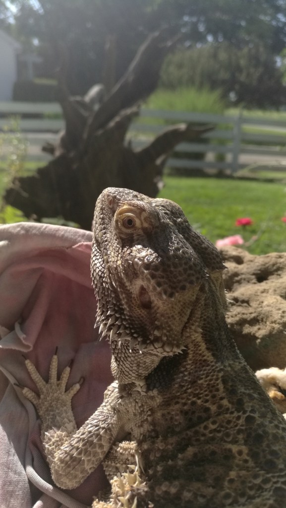 Murph’s umbrella keeps him from seeing and stressing birds of prey away in the distance. I have to move it often as the goal is for him to receive sunlight at the same time. Not always easy and this system doesn’t work when it’s windy. I never leave him outside alone. To give him as much time as possible outside, I either squint to see the laptop to do work, do yardwork, or actually relax with him. When I do things such as place fallen branches on a tarp to take to the burn pile, he basks on a hammock and pillow inside a dog crate that I reinforced with screening to protect him.