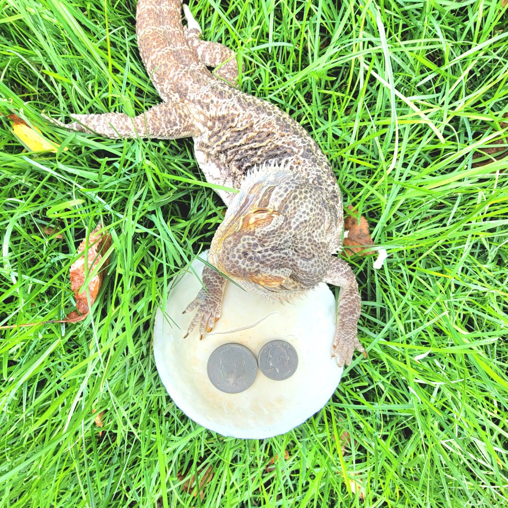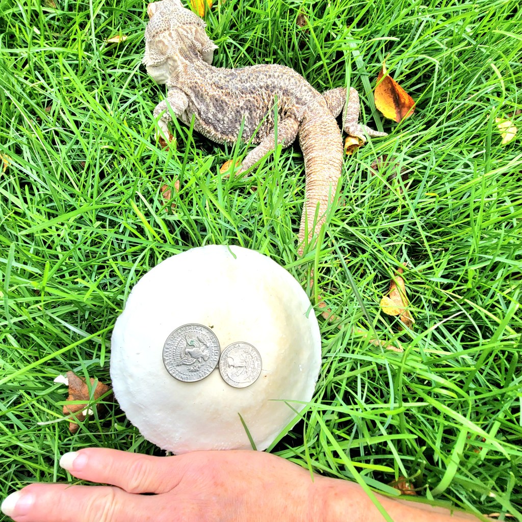 Check out these mushrooms! They bring out the fairy (or faerie) in me. The feeble attempts to place a quarter and half-dollar, as well as my hand upon and beside these shroomy beings do not depict the surprising size of them, in my opinion. I was shocked when I saw them in the neighbors’ yard and saddened when they were mowed with the grass. If they were in my yard, I’d probably trim the grass around them with scissors.😁