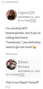 *Just love it!! And from a “dog person,” a wonderful dog dad at that! Somewhere (in the past, on his site or ours) he said he has thought of us/Murph when he sees lizards elsewhere now, his view of them has changed. Thank you, Wayne. Thank you so much. Clearly this comment hit the heart.