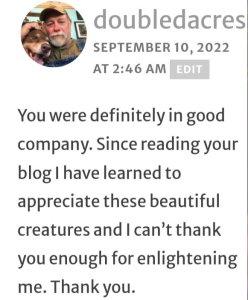 Not wanting to admit it, it’s been so long since deciding to do this, that some of these are years old. They may be found within the comment sections on this site, as well as in others’ previous posts. Unfortunately, none as of yet are found from our non-blogger email subscribers. Some of the comments below are from the same individuals. It was difficult to choose just one, obviously. So, we chose not to. I wish all the kind words from everyone were here, but we had to create a stopping point. If anyone objects to their comments made doubly public (is that really a thing?), click here.